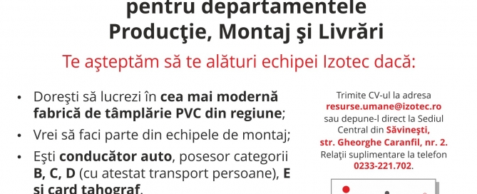 Angajăm personal pentru departamentele Producţie, Monta [...]